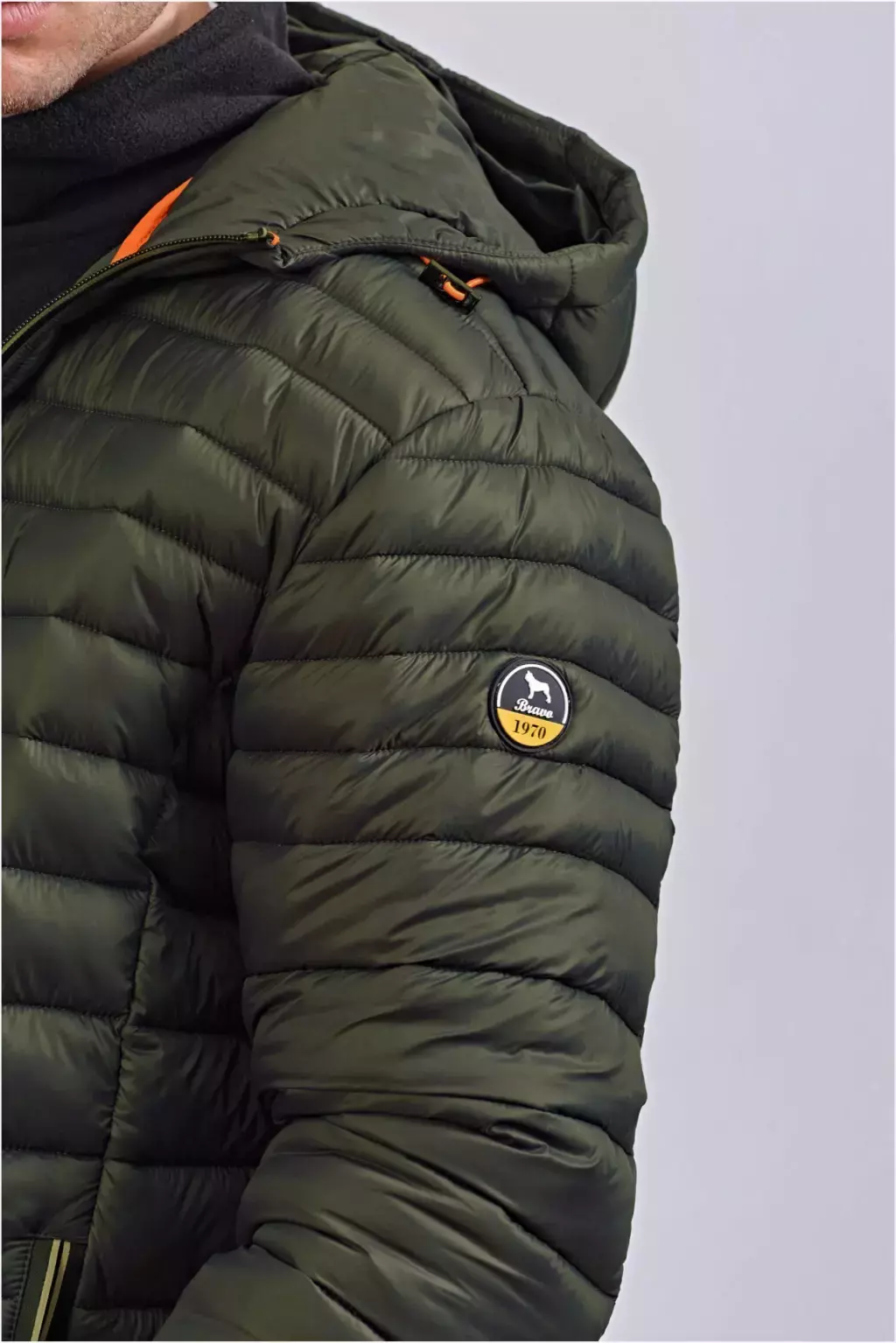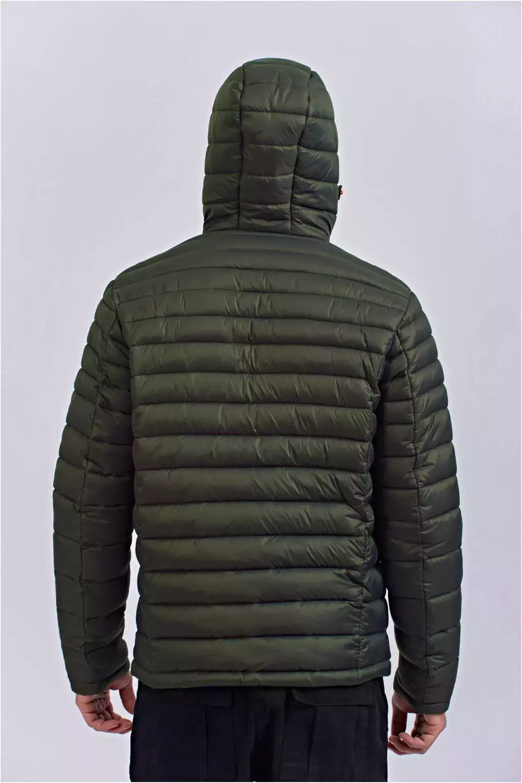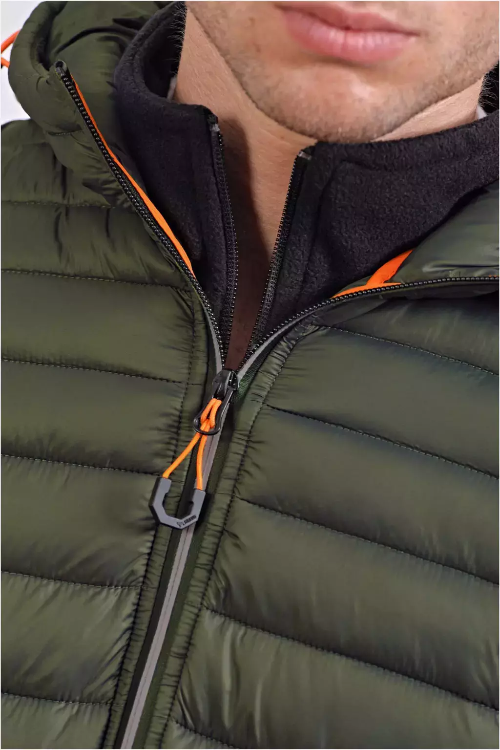 Campera con canelones, capucha no desmontable y cuello alto. Apertura frontal y bolsillos delanteros con cierres y vivos de reflex. 100% Poliéster